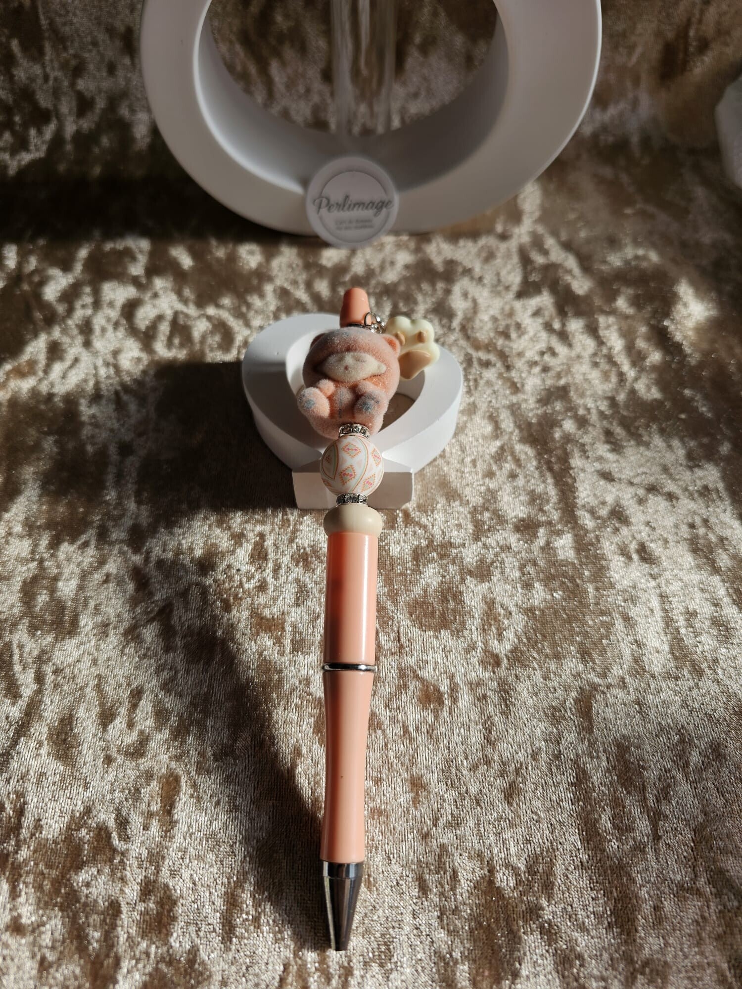 Stylo Kawaii à bille, encre bleu. Corps en plastique corail pastel de 14.6 cm. Perles en silicone, rondelles en strass, sujet duveteu et breloque en résine.
